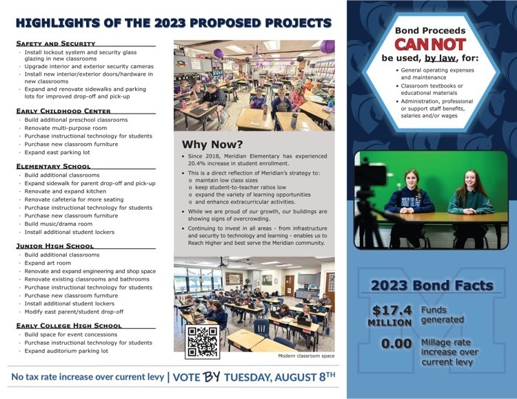 📣 There is an important item on the ballot for the Tuesday, August 6th election for the voters in Meridian Public School District. This millage is a significant part of our district’s funding, contributing over $1.7 million to our annual operating budget.